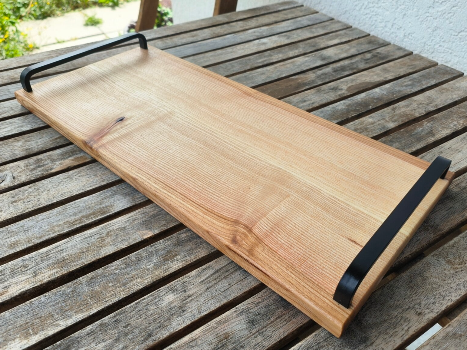 Stilvolles kleines Servier-Tablar aus Eschenholz mit schwarz lackierten Alluminiumgriffen in moderner Optik. Fein geschliffen und mit "food-grade" Mineralöl behandelt für eine lange lebensdauer und gleichbleibender Look. Kanten gerundet.